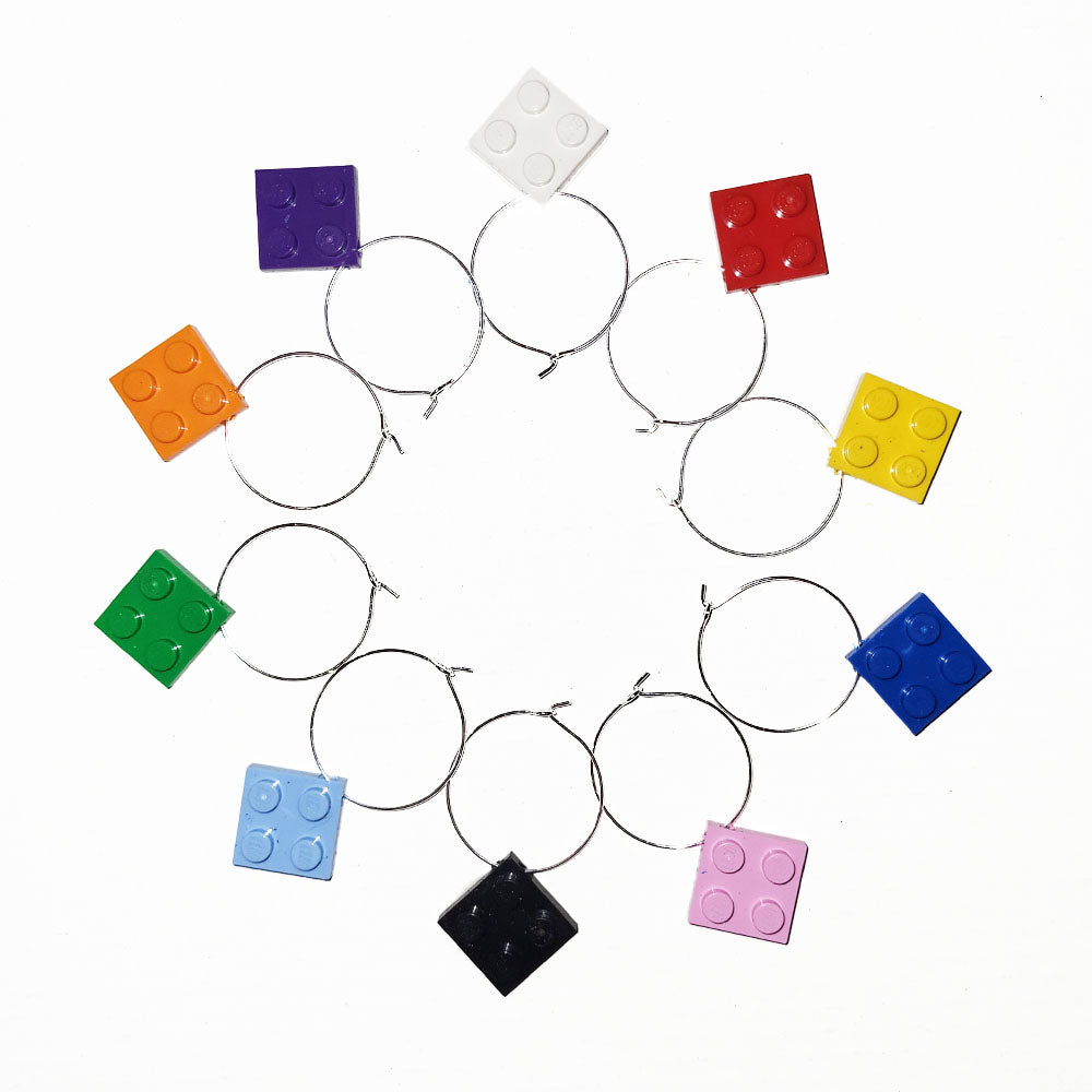 Each of the ten charms in this set is a different color 2 x 2 Lego plate on a wire hoop. Attach one to the stem of your glass and add a bit of whimsy to your next party. When the party’s over, they stack together, because, well, they’re Lego!