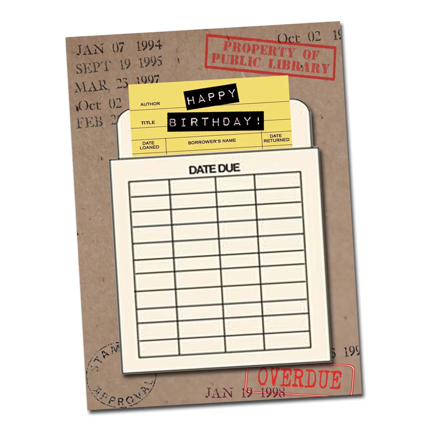 This greeting card brings back the charm of old library books with a nostalgic twist. Each card is printed on heavyweight kraft paper and has a classic library book pouch affixed to the front, just like the ones found in well-loved library books of the past. Tucked inside is an authentic vintage date due card, printed with a special message. The card slides in and out of the pouch, making it a unique keepsake that can be displayed, reused, or even repurposed as a bookmark.