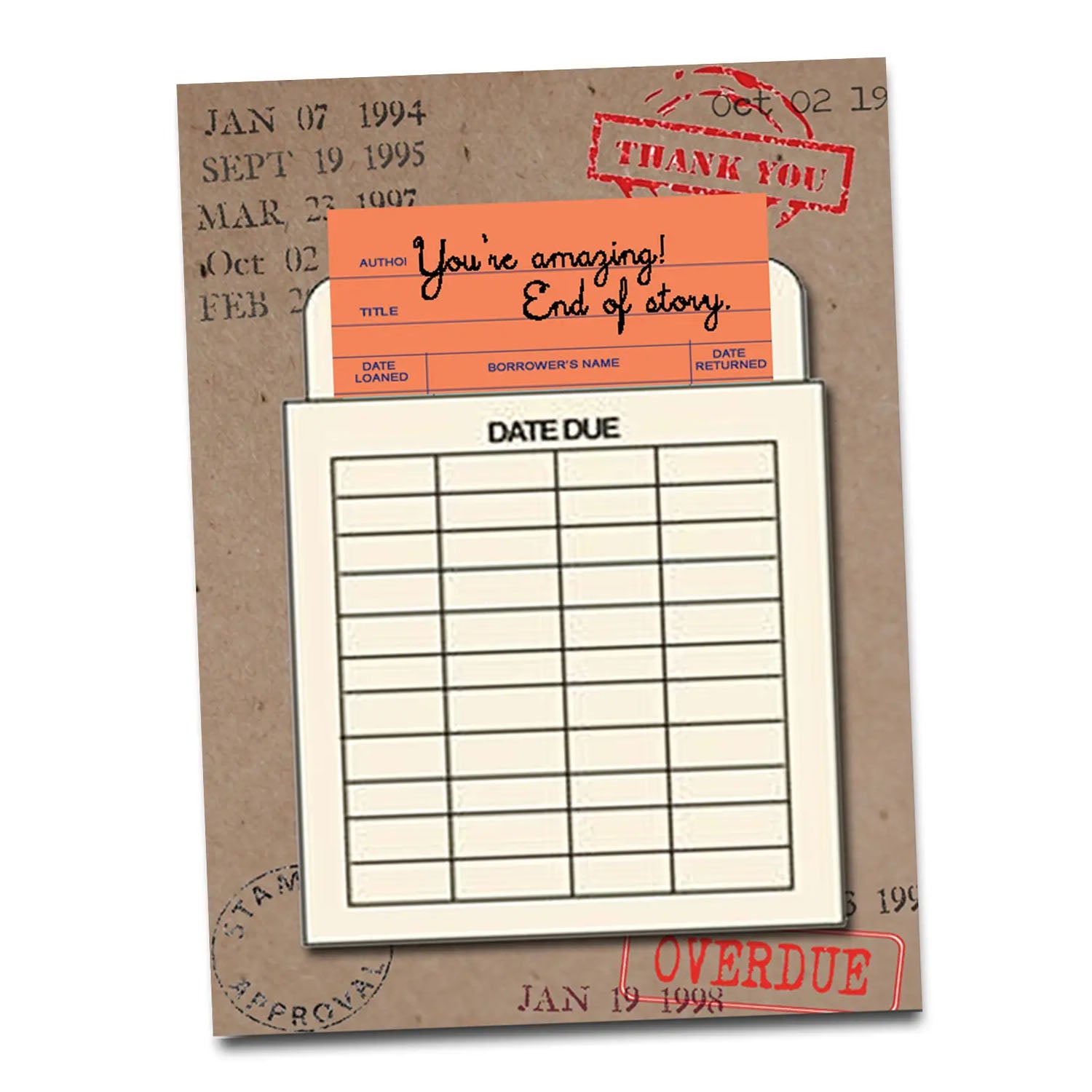 This greeting card brings back the charm of old library books with a nostalgic twist. Each card is printed on heavyweight kraft paper and has a classic library book pouch affixed to the front, just like the ones found in well-loved library books of the past. Tucked inside is an authentic vintage date due card, printed with a special message. The card slides in and out of the pouch, making it a unique keepsake that can be displayed, reused, or even repurposed as a bookmark.