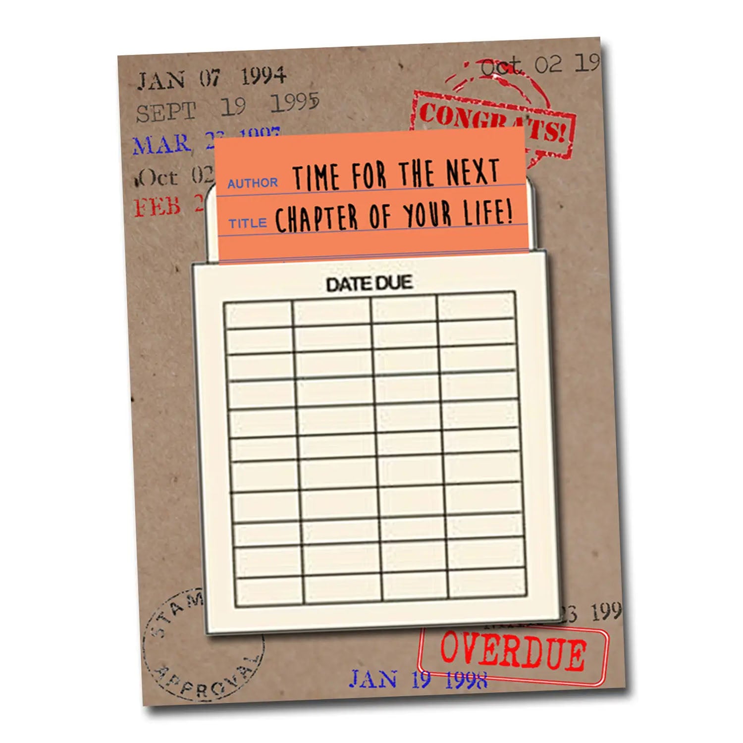 This greeting card brings back the charm of old library books with a nostalgic twist. Each card is printed on heavyweight kraft paper and has a classic library book pouch affixed to the front, just like the ones found in well-loved library books of the past. Tucked inside is an authentic vintage date due card, printed with a special message. The card slides in and out of the pouch, making it a unique keepsake that can be displayed, reused, or even repurposed as a bookmark.