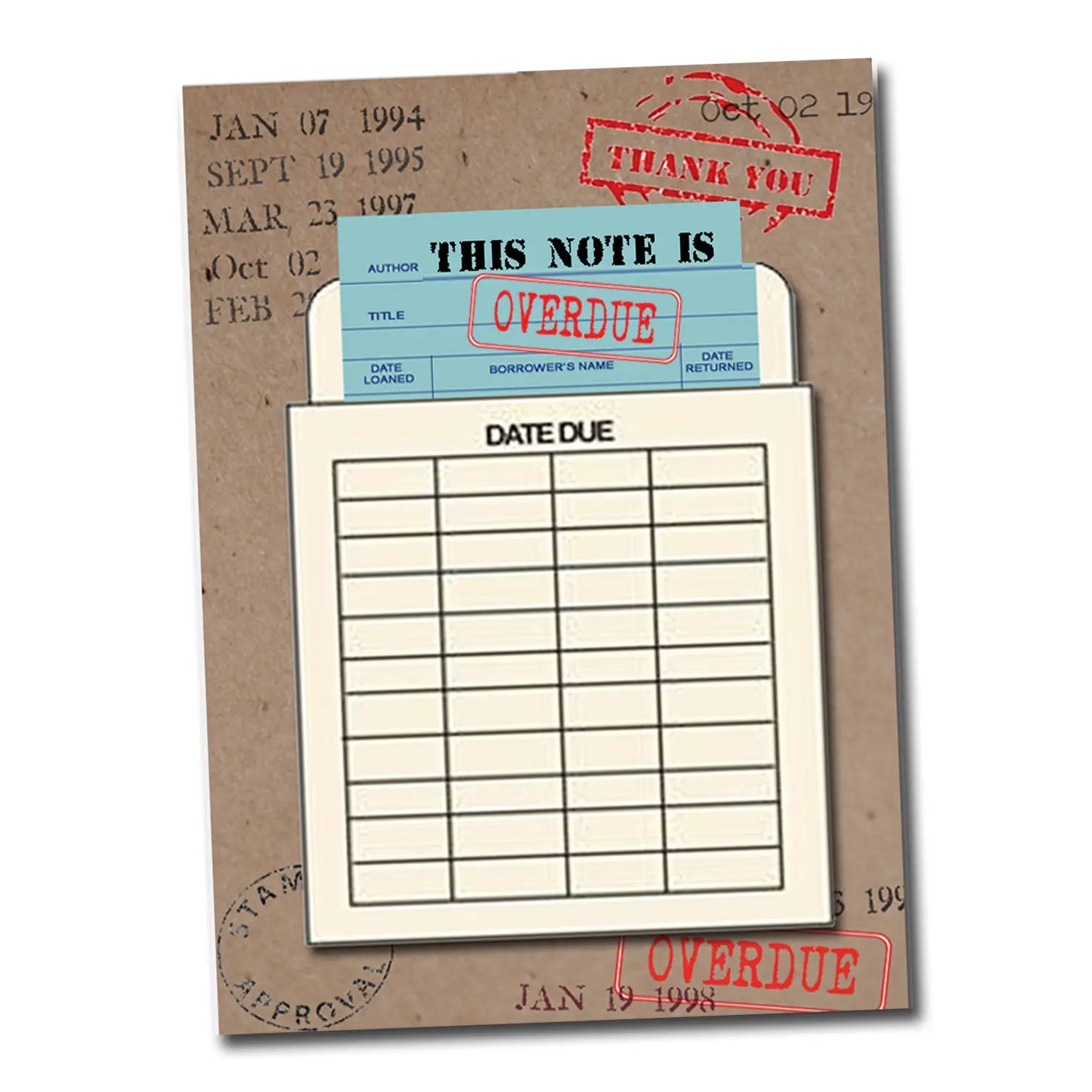 This greeting card brings back the charm of old library books with a nostalgic twist. Each card is printed on heavyweight kraft paper and has a classic library book pouch affixed to the front, just like the ones found in well-loved library books of the past. Tucked inside is an authentic vintage date due card, printed with a special message. The card slides in and out of the pouch, making it a unique keepsake that can be displayed, reused, or even repurposed as a bookmark.