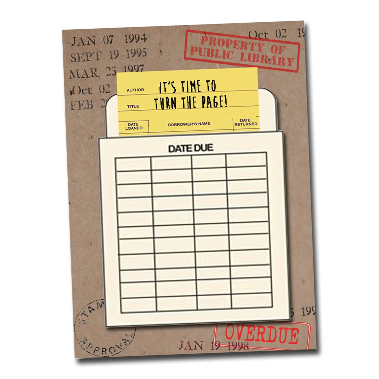 This greeting card brings back the charm of old library books with a nostalgic twist. Each card is printed on heavyweight kraft paper and has a classic library book pouch affixed to the front, just like the ones found in well-loved library books of the past. Tucked inside is an authentic vintage date due card, printed with a special message. The card slides in and out of the pouch, making it a unique keepsake that can be displayed, reused, or even repurposed as a bookmark.