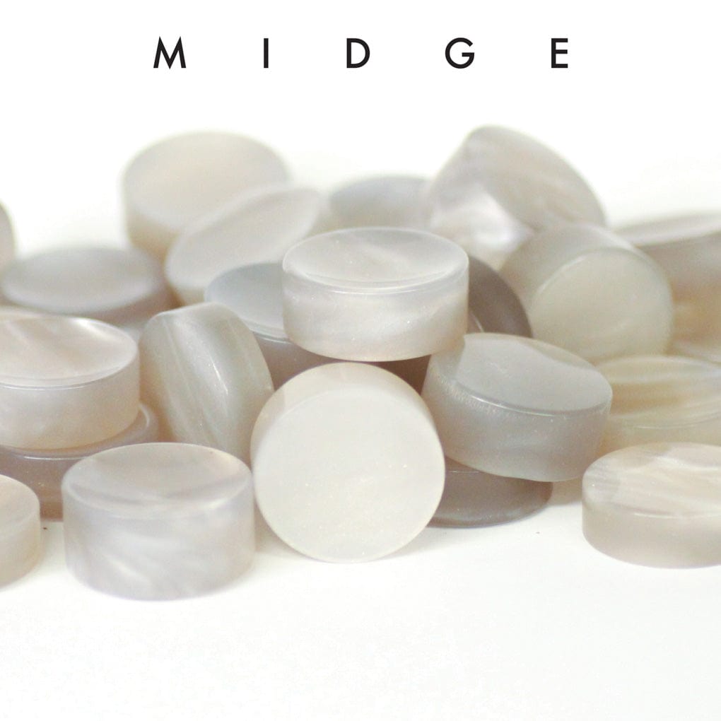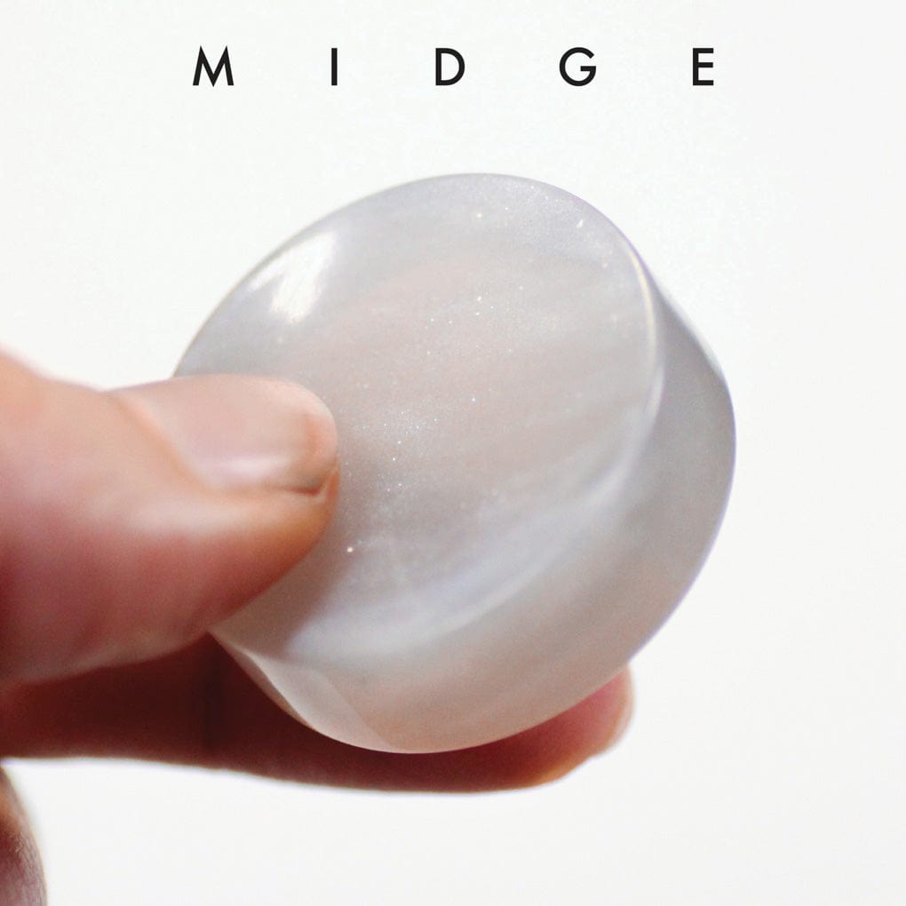 These Bowlerite Worry Stones were made in Arkansas from discarded bowling balls. They're a bit over an inch in diameter and have one concave side, "for maximum satisfaction when holding between forefinger and thumb." Midge is pearly white with flecks of white glitter, .2" to .6" thick. This worry coin will be glossier and has a smoother texture than most. The maker packages them in a zipper bag with a small booklet of bowling terms.