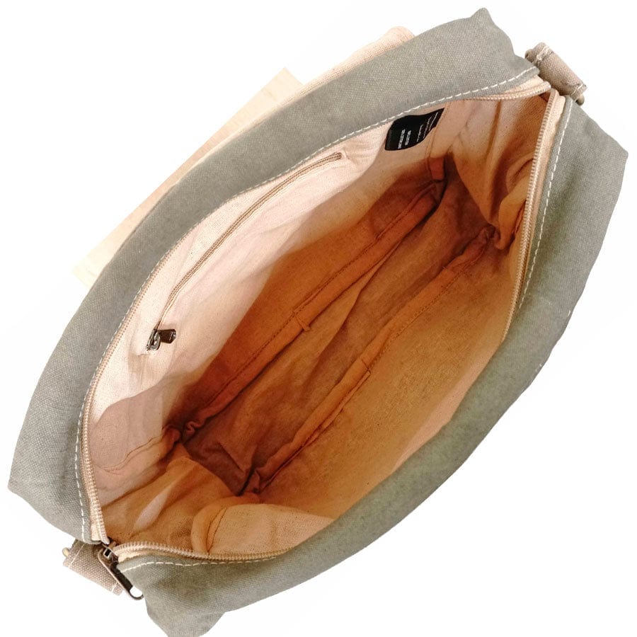 This messenger bag is made from recycled military tents. It's fully lined, with a top zipper and one interior zipped pocket, as well as a 57" adjustable shoulder strap.