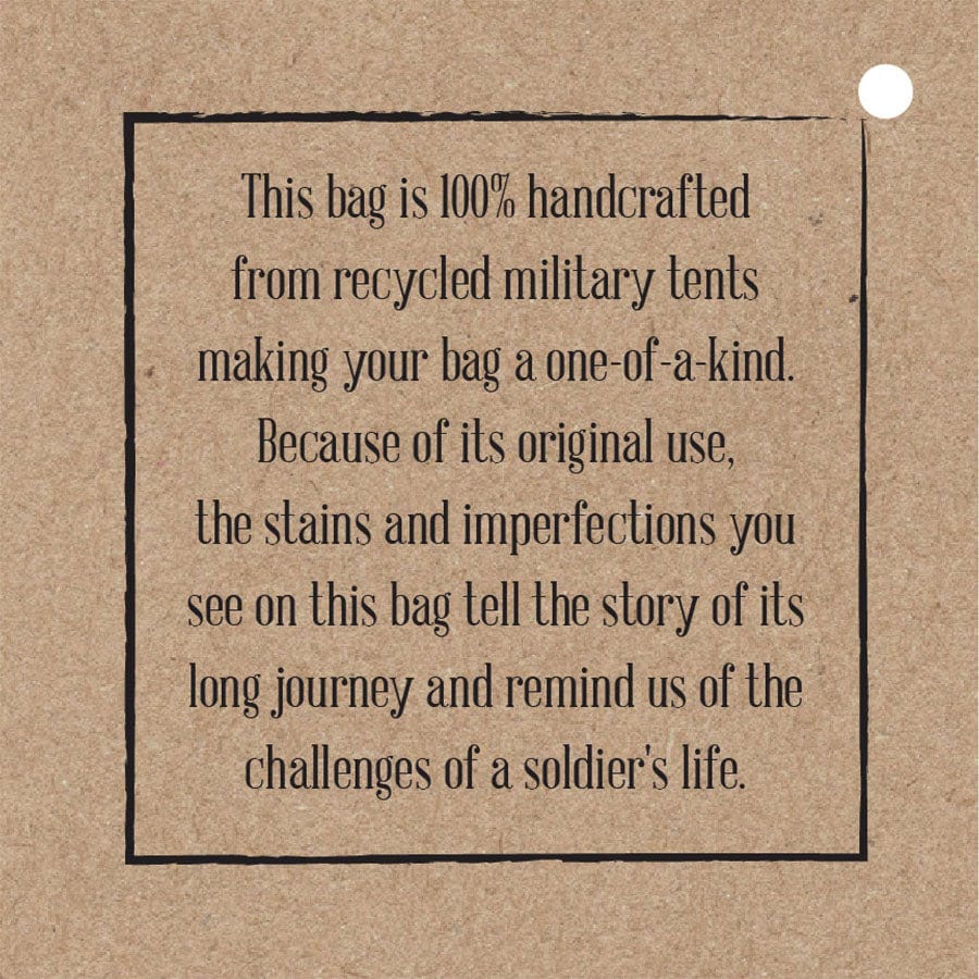 Vintage Addiction's recycled military tent bags are a tribute to and a reminder of the sacrifices and contributions of military veterans. Please know that these bags are made from authentic used military tents and are not brand new canvas packaged as recycled tents or tarps. THESE ARE THE REAL DEAL!! As a result, the tent material will show signs of worn-like imperfections which add to its character. Each bag has differences in genuine imperfections, stains, and colors. Your bag will be as unique as each soldier's experience when seeking shelter in these tents whether in the training field or in a combat zone.
