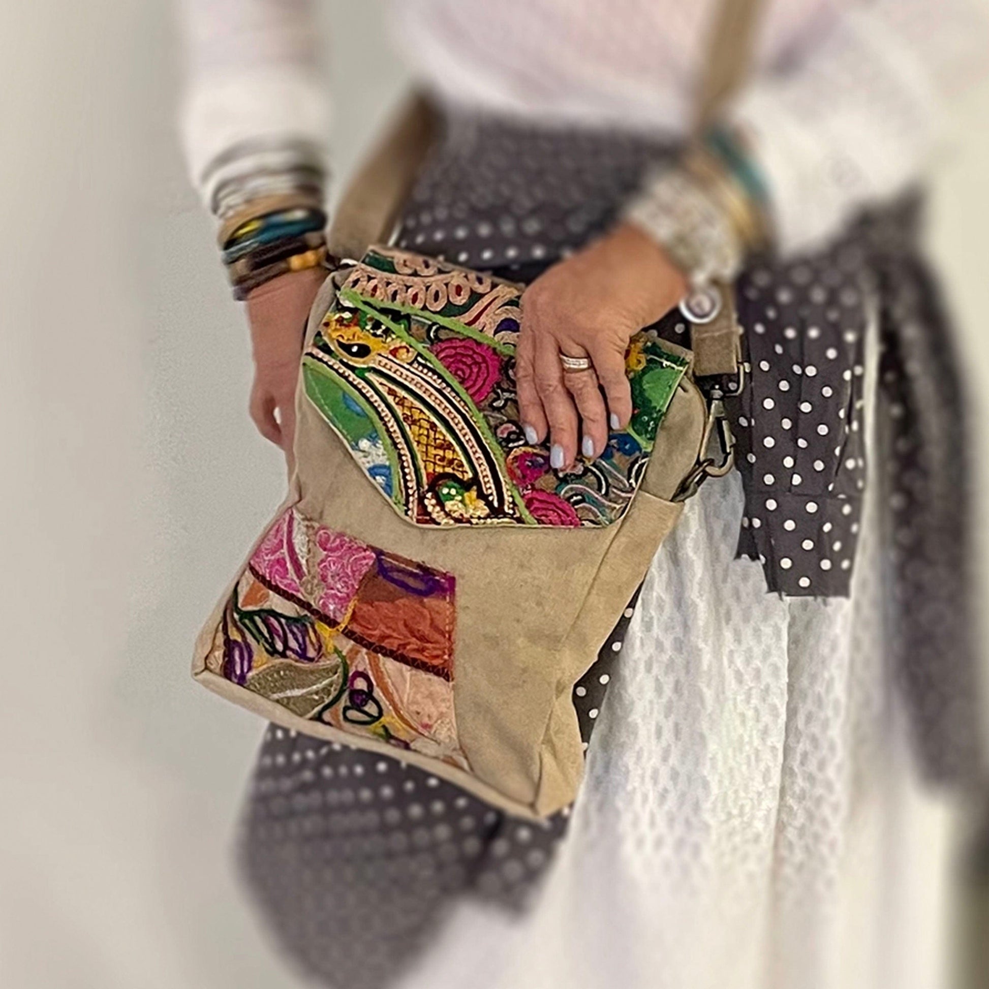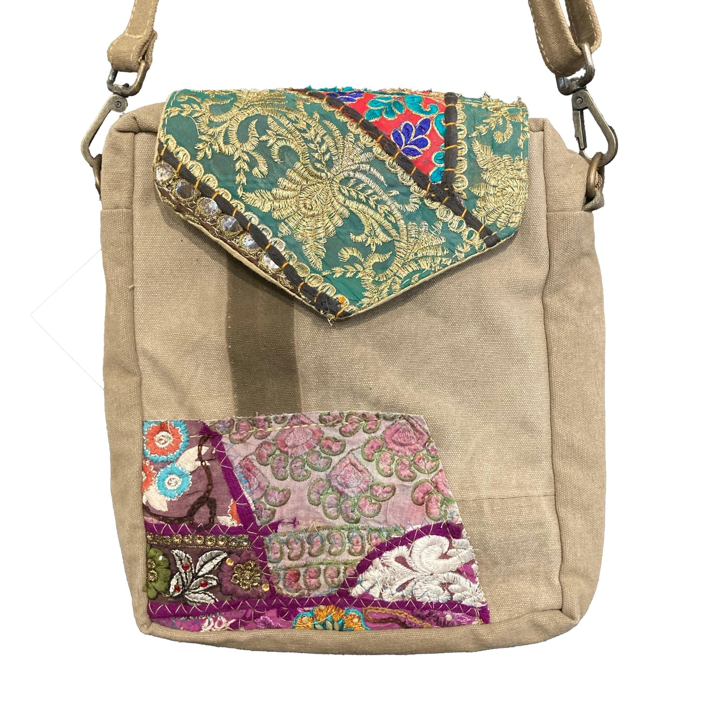 This medium-sized crossbody is artisan crafted with recycled military tents and embellished with unique vintage fabric pieces. The fully-lined interior has a smaller pocket for your phone or wallet. The bag has a zip closure under the flap, which has a magnetic snap. The strap is adjustable and can be removed.