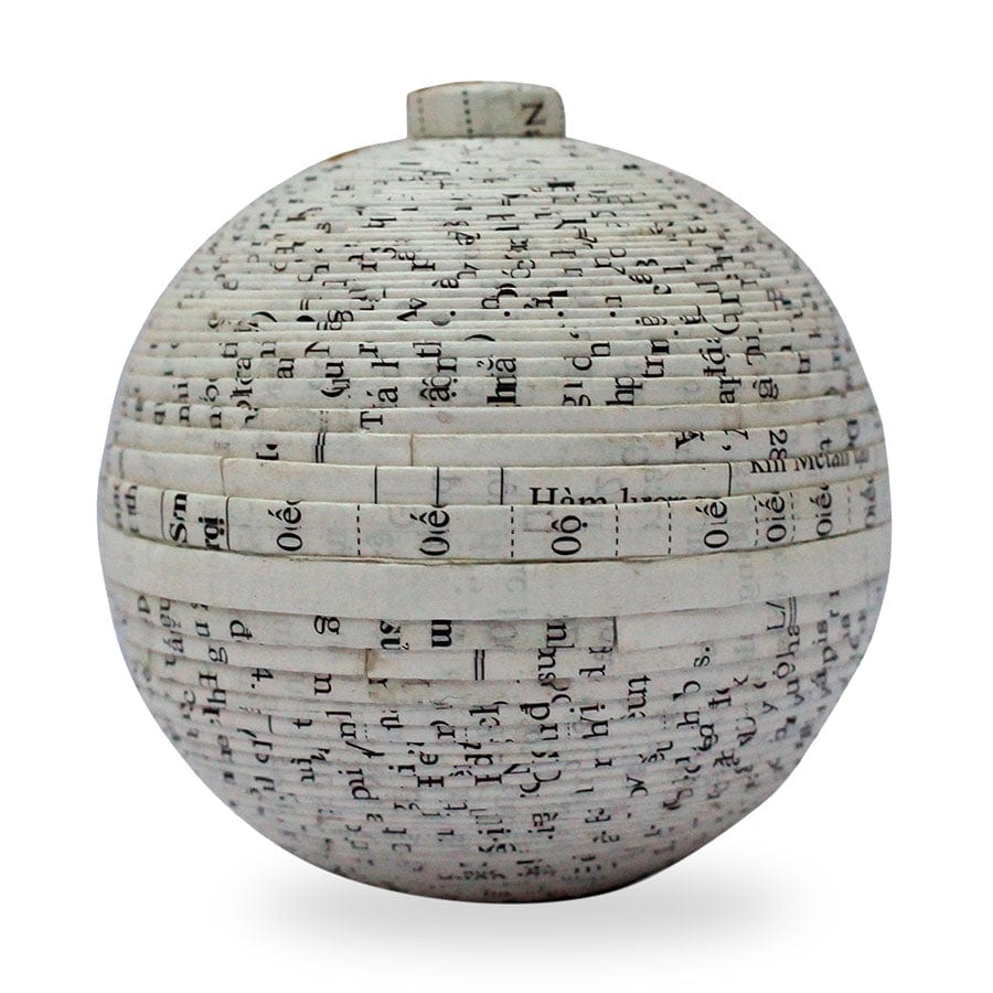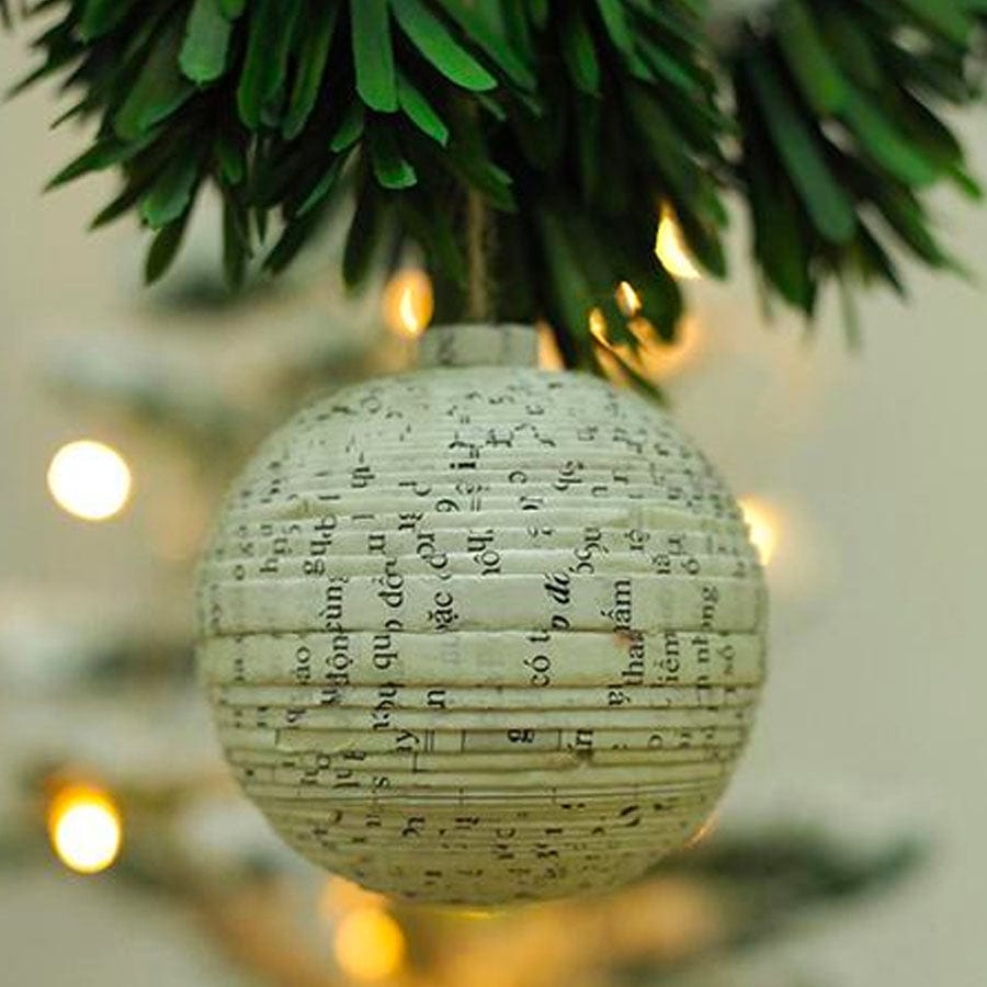 These large but lightweight Christmas ornaments are made with recycled printed pages and are hollow. They are beautiful in their simplicity, with no colors or decoration other than the black words on the white page.