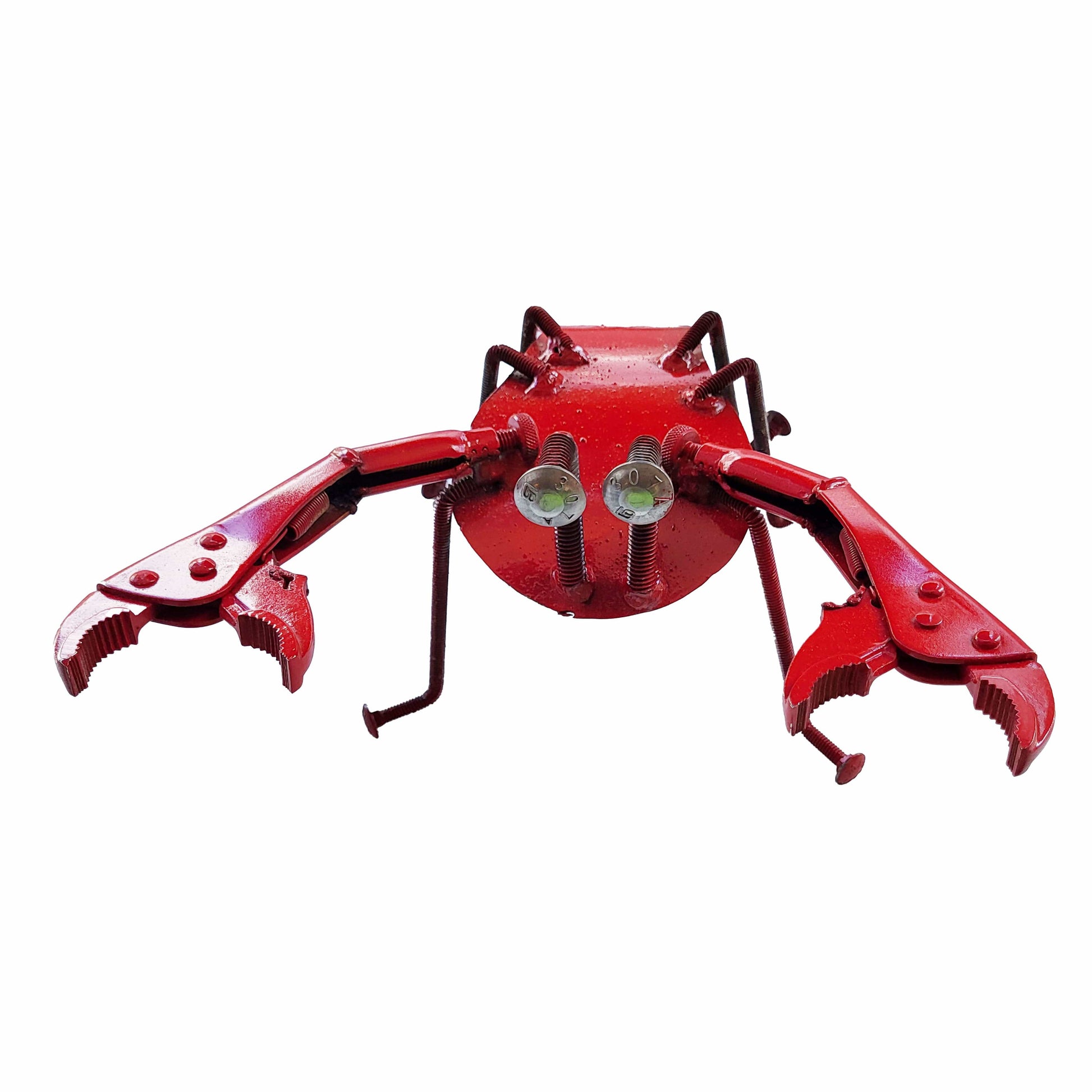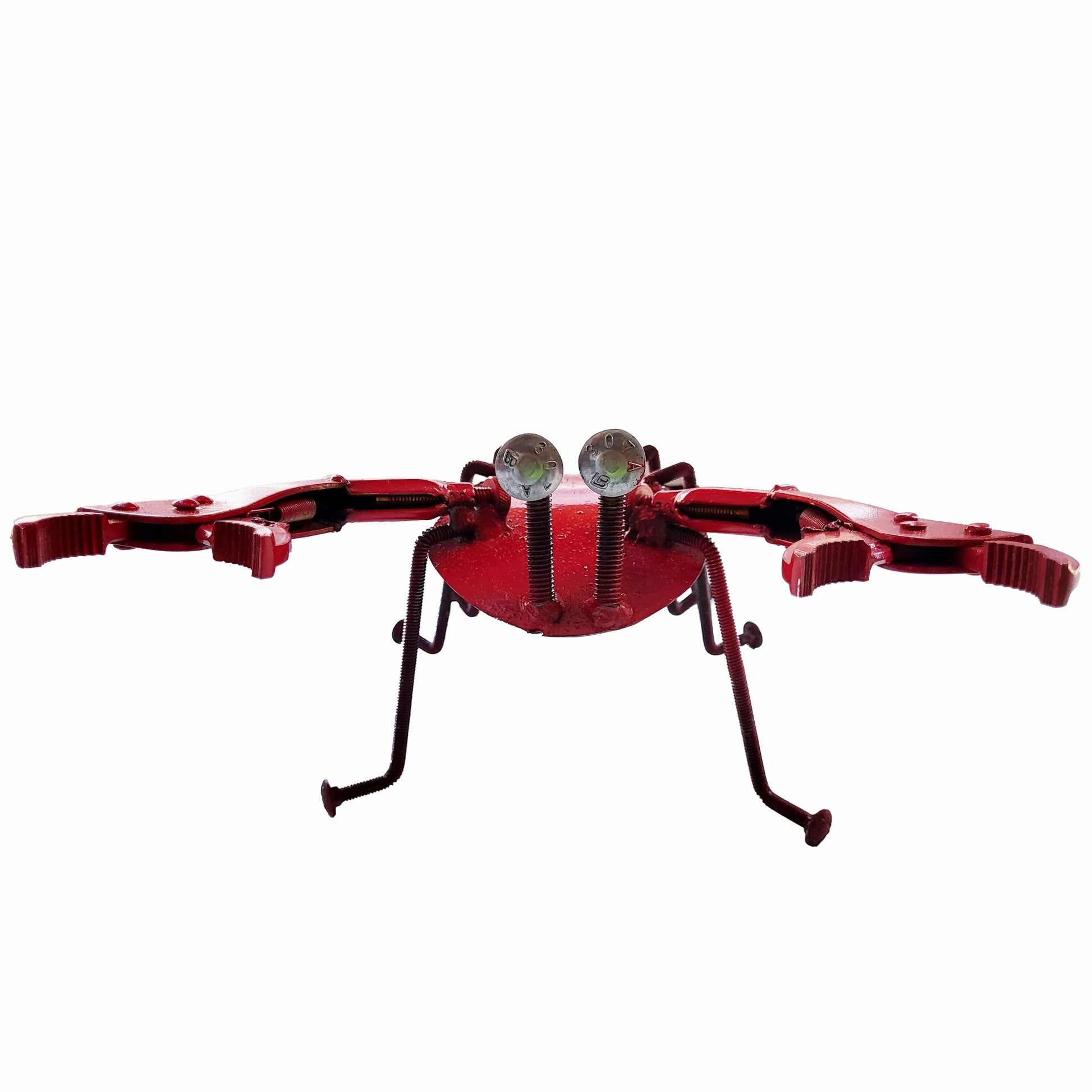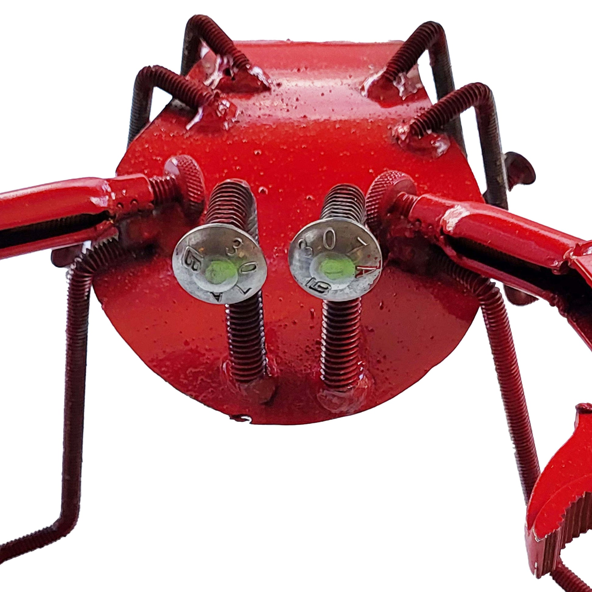 The legs and eyes of this cute little crustacean are made from carriage bolts, with the body and tail made from scrap metal. After it's assembled, the entire top (except for those eyes) is spray-painted a bright, bold, but imperfect red, giving it an industrial look.