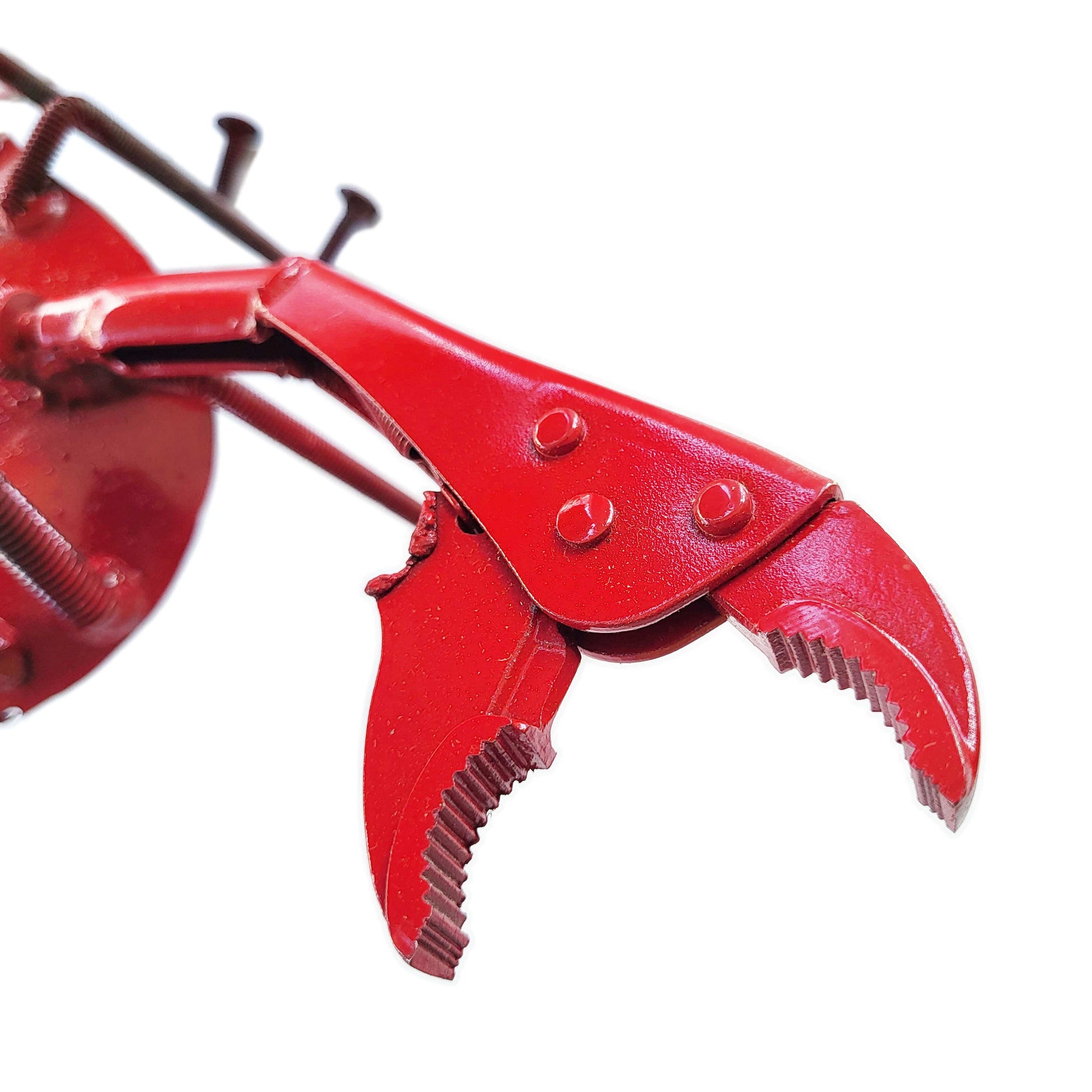This scrap metal lobster has claws made from locking pliers. You might want to call them Vise-Grips®, but Vise-Grips® is a brand name, so we'll call them locking pliers to avoid any legal action. Only the "jaws" of these Vi-- locking pliers remain; the locking side has been removed and the jaws are welded in the open position.