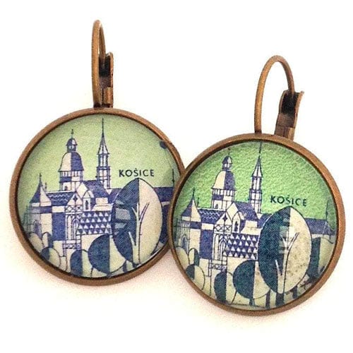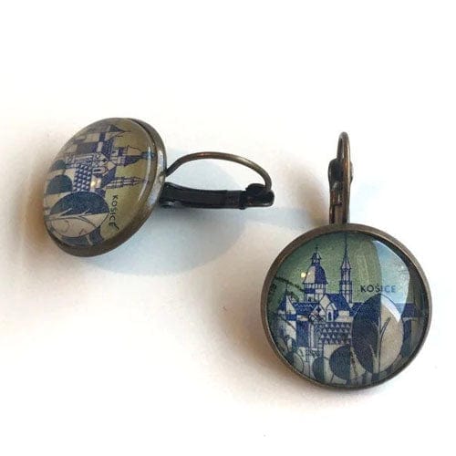 This is a pair of French clip earrings in an antique bronze finish and features a 1965 Czech Stamp from Czechoslovak cities series. The Stamp depicts Kosice, the biggest city in eastern Slovakia and in 2013 was the European Capital of Culture.