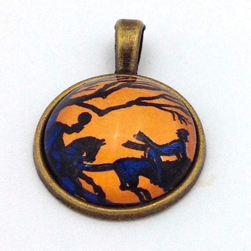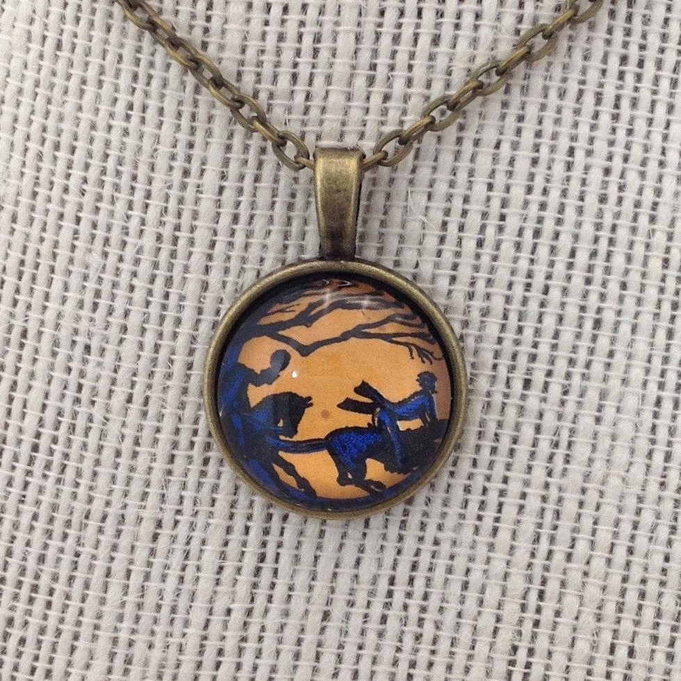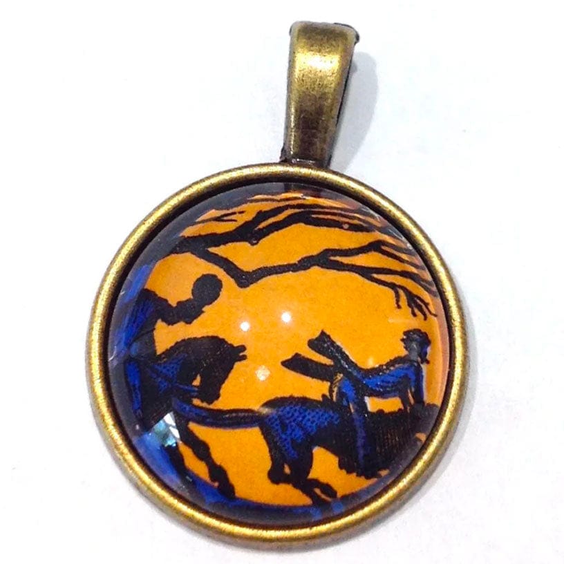 This necklace features a 1974 10¢ American stamp called "Legend of Sleepy Hollow: Headless Horseman and Ichabod" from the American Folklore series.