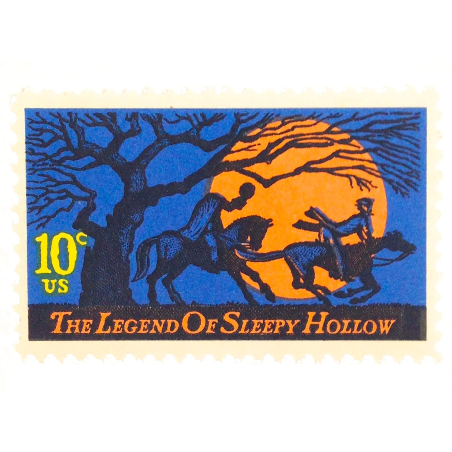 The stamp depicts the famous tale written by Washington Irving published in 1820. The story is set in 1790 in the countryside around the Dutch settlement of historical Tarrytown, New York, in a secluded glen called Sleepy Hollow.