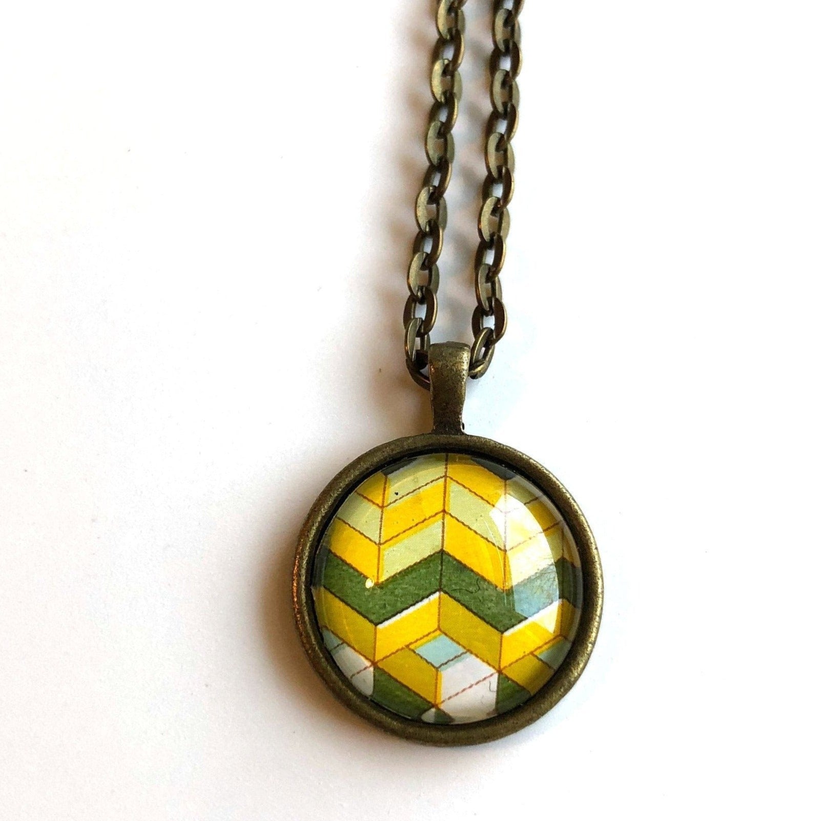 This necklace features a 2011 United Kingdom postage stamp from the British traditional textiles series. This stamp depicts "Chevron" by Andrew Foster.