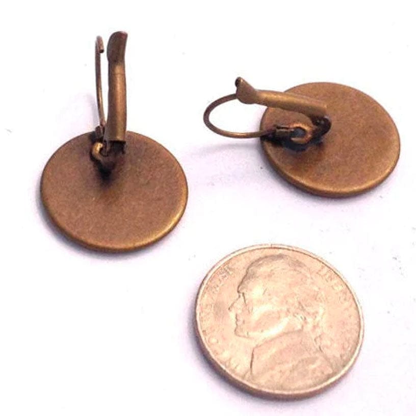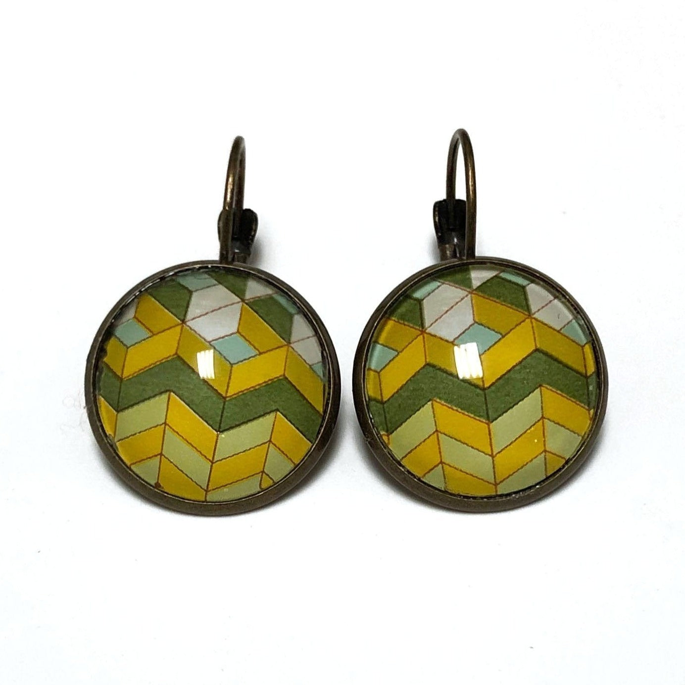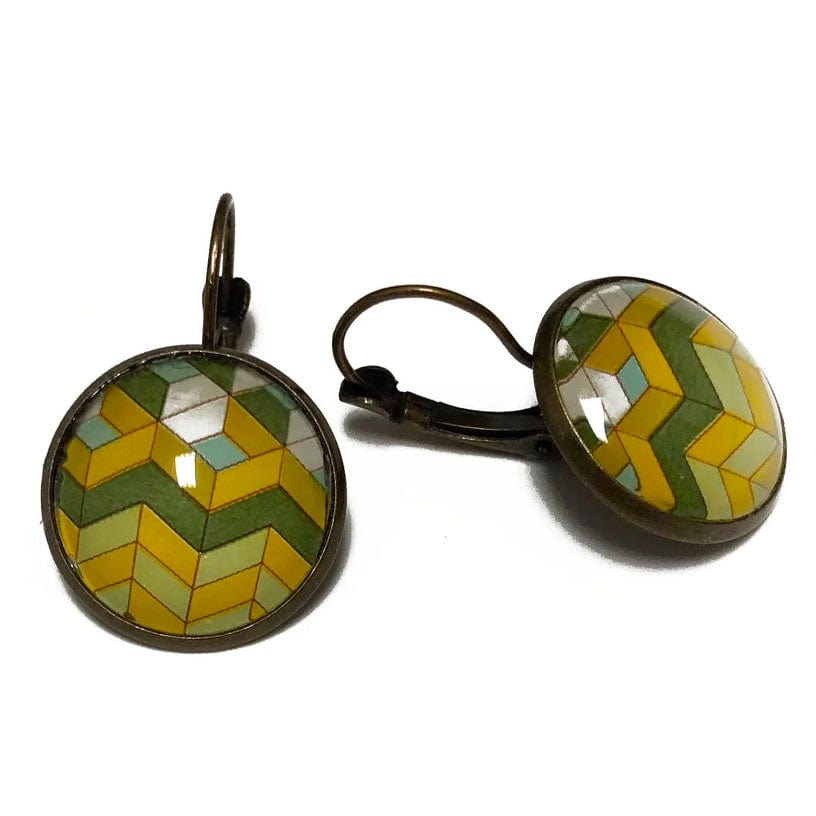 This is a pair of French clip earrings in an antique bronze finish and features a 1982 postage stamp from the United Kingdom from the British Textile series of Chevron.