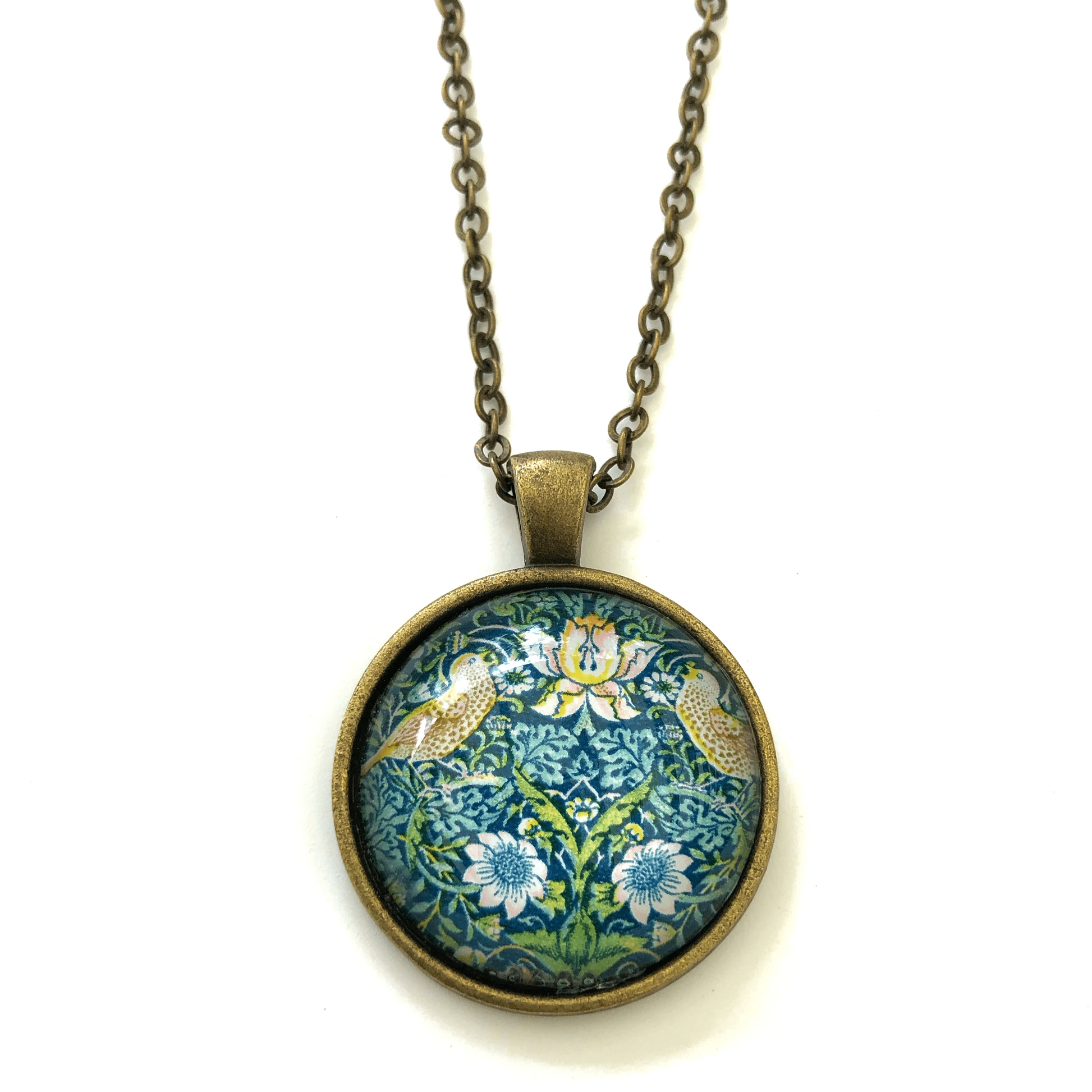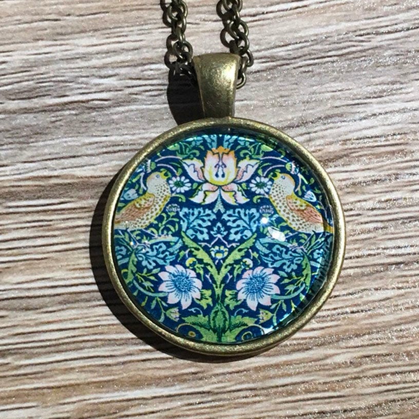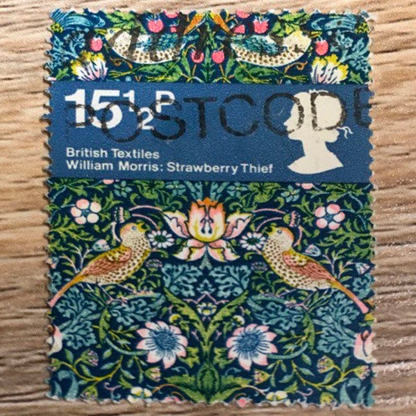 This necklace features a 1982 UK stamp from the British Textile series. This stamp commemorates the Strawberry Thief textile by William Morris c.1880, one of his most popular designs.