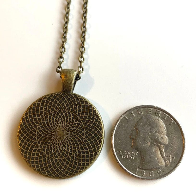 The size of the pendant is 1 inch in diameter and the chain is 18 inches long, in a matching antique bronze finish with a lobster clasp.