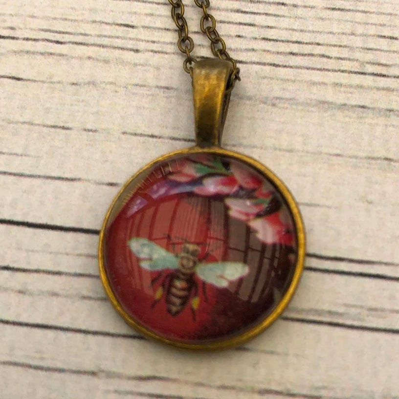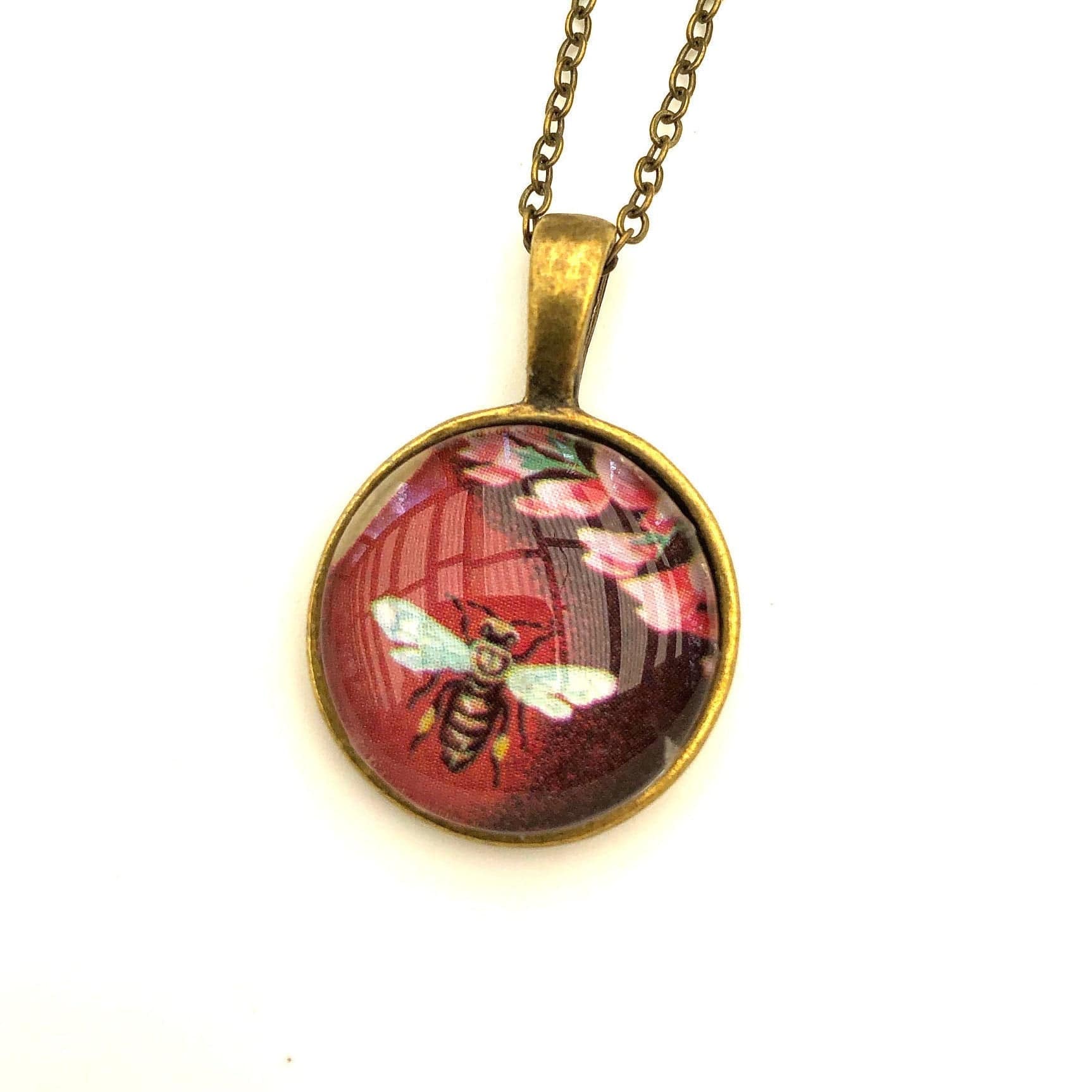 This necklace features a 1987 Bulgarian postage stamp from the bees and plants series.