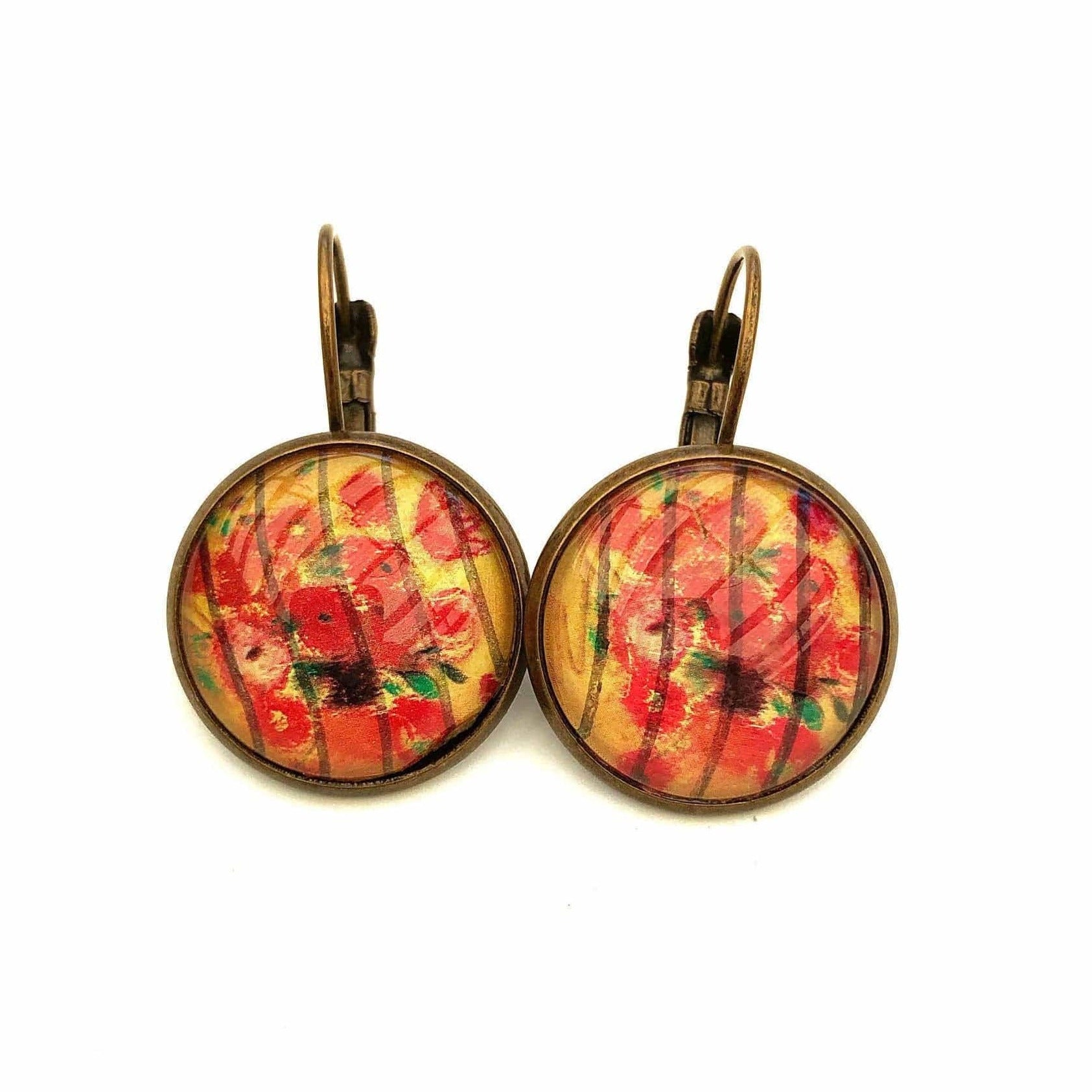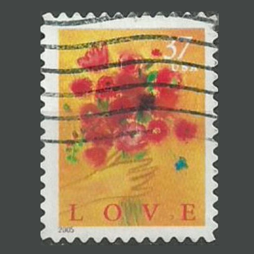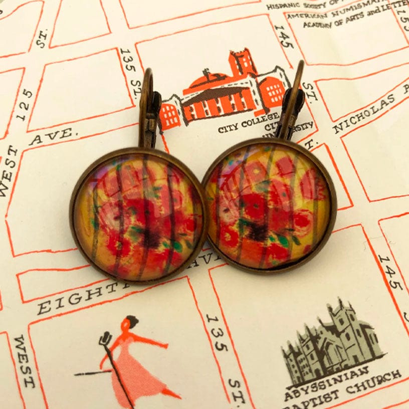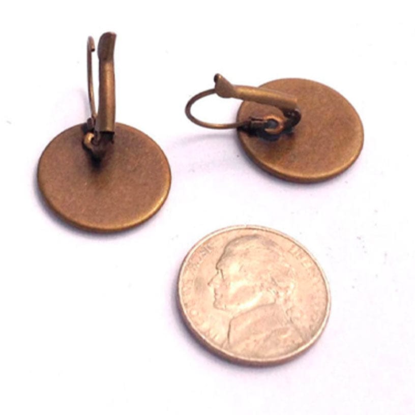 This is a pair of French clip earrings in an antique bronze finish and features a 2005 postage stamp from the United States featuring a bouquet of flowers from the love series.