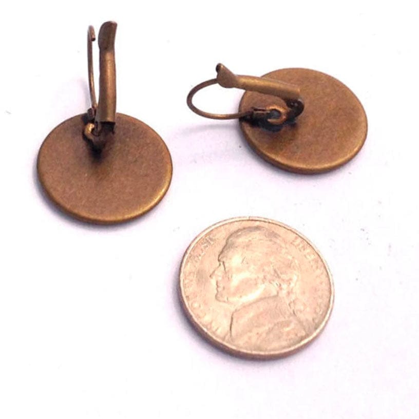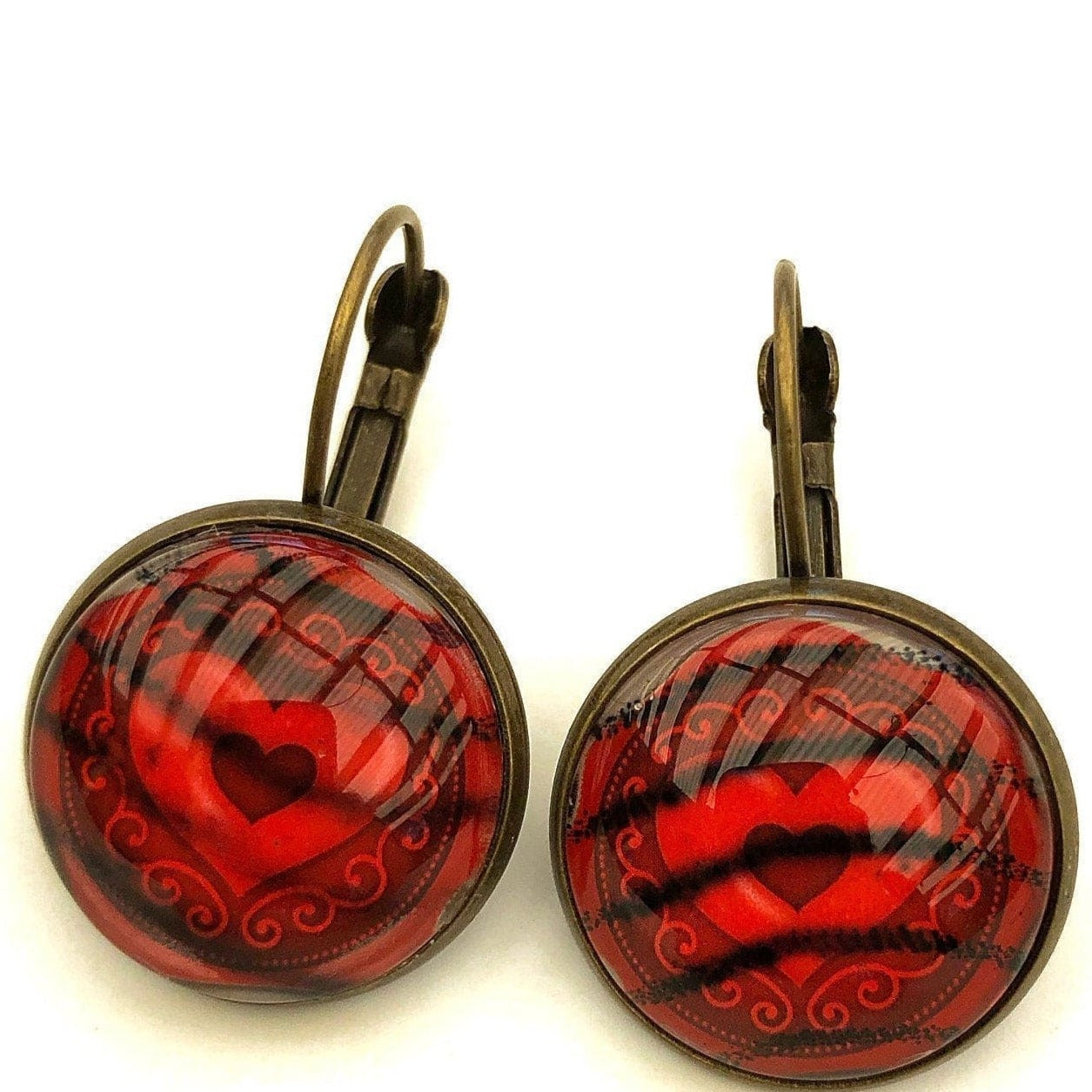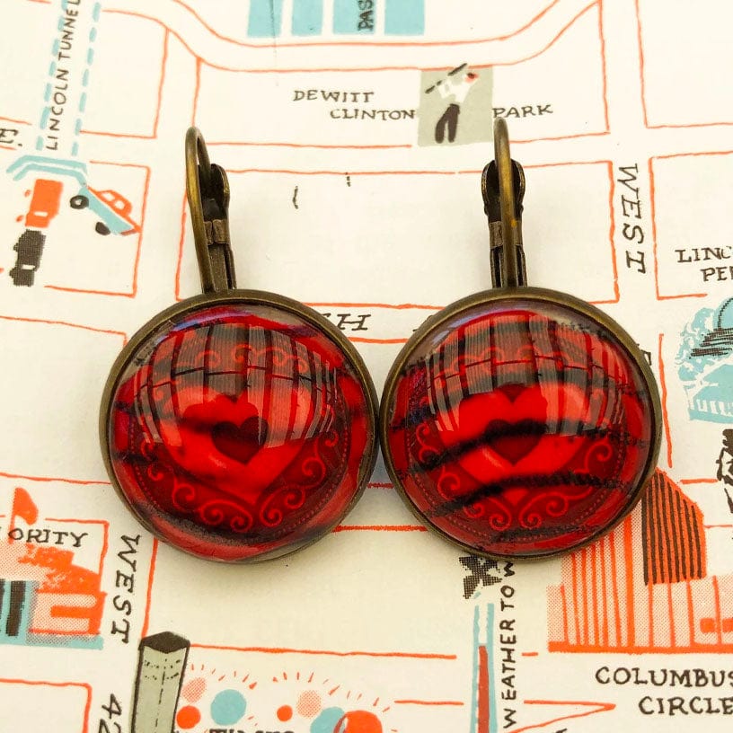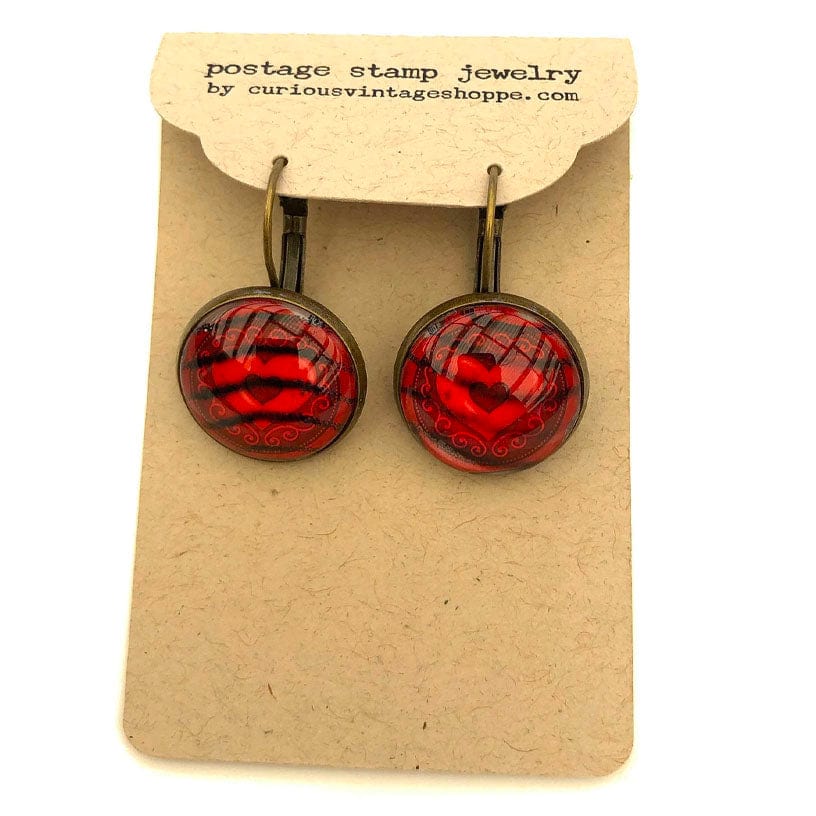 This is a pair of French clip earrings in an antique bronze finish and features a 2013 postage stamp from the United States called "Sealed with Love," from the love series.