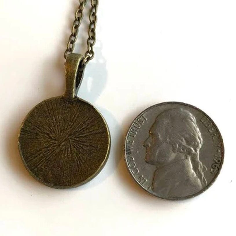 The size of the pendant is 18mm and the chain is 18 inches long, in a matching antique bronze finish with a lobster clasp.