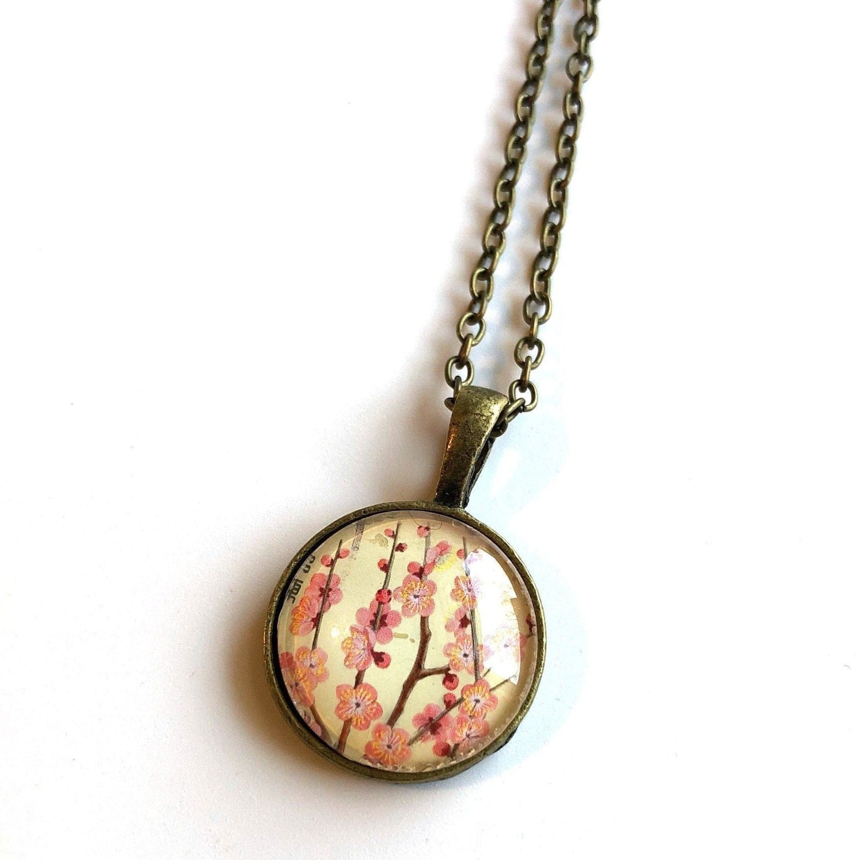 This necklace features a 2014 Japanese postage stamp of cherry blossoms.
