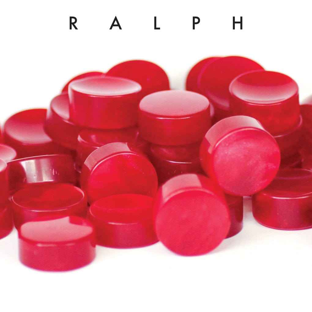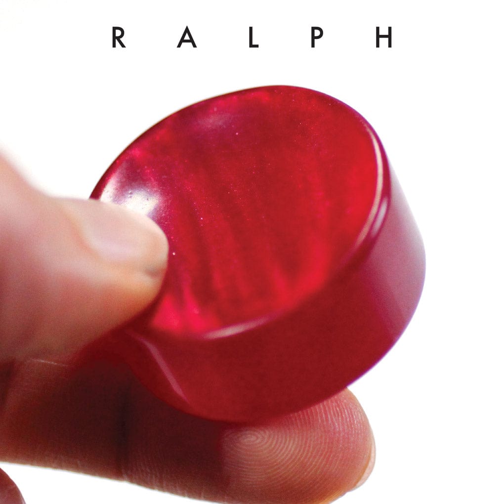 These Bowlerite Worry Stones were made in Arkansas from discarded bowling balls. They're a bit over an inch in diameter and have one concave side, "for maximum satisfaction when holding between forefinger and thumb." Ralph is cherry red with hints of red glitter, and .3" to .6" thick. This worry stone will be glossier and has a smoother texture than most. The maker packages them in a zipper bag with a small booklet of bowling terms.