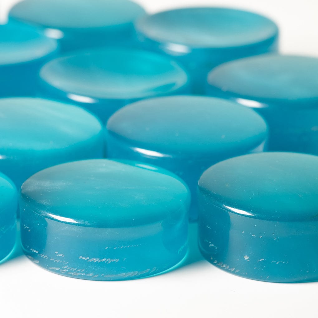 These Bowlerite Worry Stones were made in Arkansas from discarded bowling balls. They're a bit over an inch in diameter and have one concave side, "for maximum satisfaction when holding between forefinger and thumb." Roy Neil is a cloudy light blue that is semi-translucent, and from .4" to .6" thick. The maker packages them in a zipper bag with a small booklet of bowling terms.