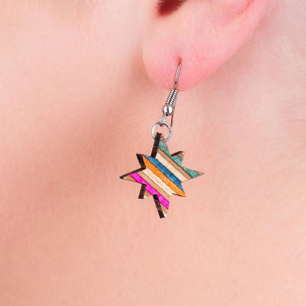 These star dangles display the vibrant layers of plywood, which are fused together with grains in varying directions to create a sturdy skateboard deck. Your matching set will have random colors, making each pair unique. A rad gift for skating fans or those with fond memories of the sport.