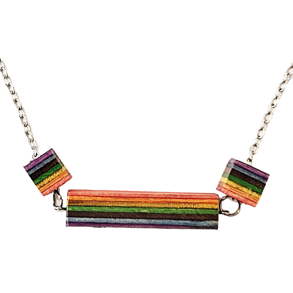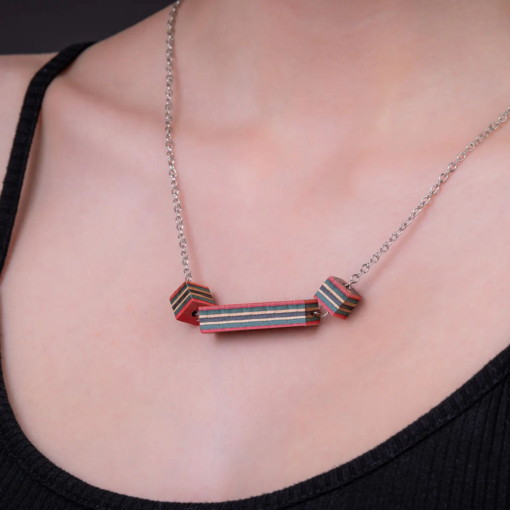 This necklace has three blocks—a long one in the center flanked by two small cubes—on a 20" stainless steel chain (with a 2" extender). Each displays the vibrant layers of plywood, which are fused together with grains in varying directions to create a sturdy skateboard deck. Your necklace will have random colors with the layers going in different directions, making each a one-of-a-kind. A rad gift for skating fans or those with fond memories of the sport.
