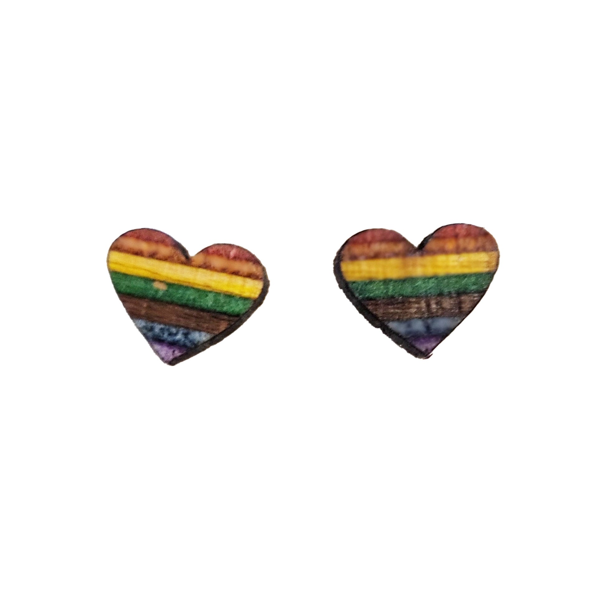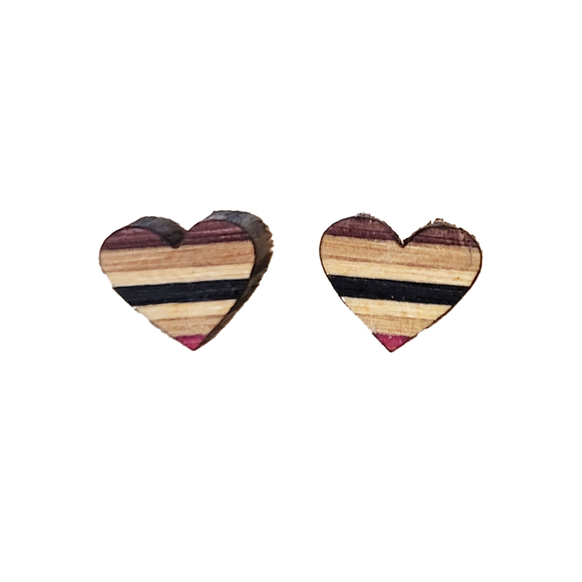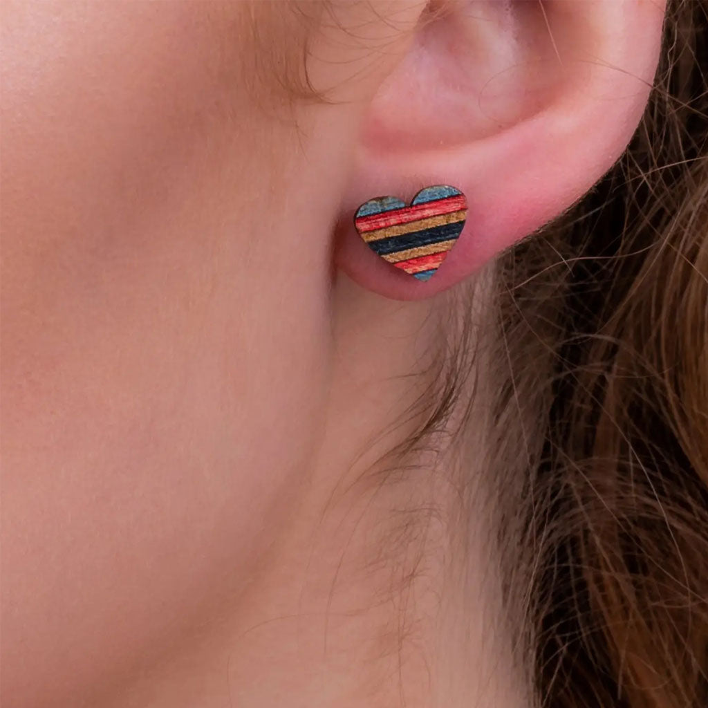 These earrings are made by a skate enthusiast who has seen countless boards discarded without a second thought. With a creative and passionate approach to crafting, he transforms abandoned skateboards into beautiful jewelry. Each small heart displays the vibrant layers of plywood, which are fused together with grains in varying directions to create a sturdy skateboard deck. Your matching set will have random colors, making each pair unique. A rad gift for skating fans or those with fond memories of the sport.