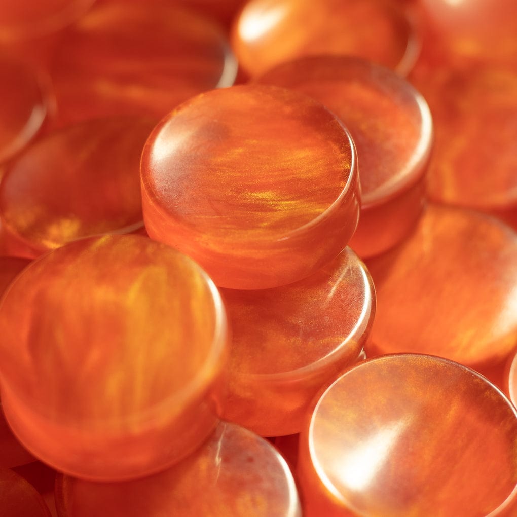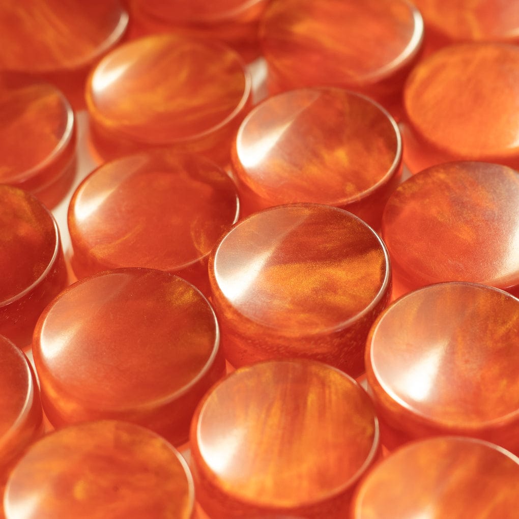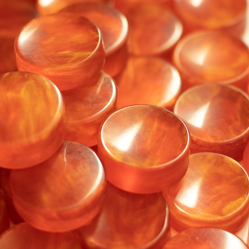 These Bowlerite Worry Stones were made in Arkansas from discarded bowling balls. They're a bit over an inch in diameter and have one concave side, "for maximum satisfaction when holding between forefinger and thumb." Skee is a deep orange color, and .3" to .5" thick. Some of Skee's Worry Stones have "extraction swirls" around the outside edge. You may get a completely smooth edge or a smooth edge interrupted by one or two shallow cut lines. The maker packages them in a zipper bag with a small booklet of bowling terms.