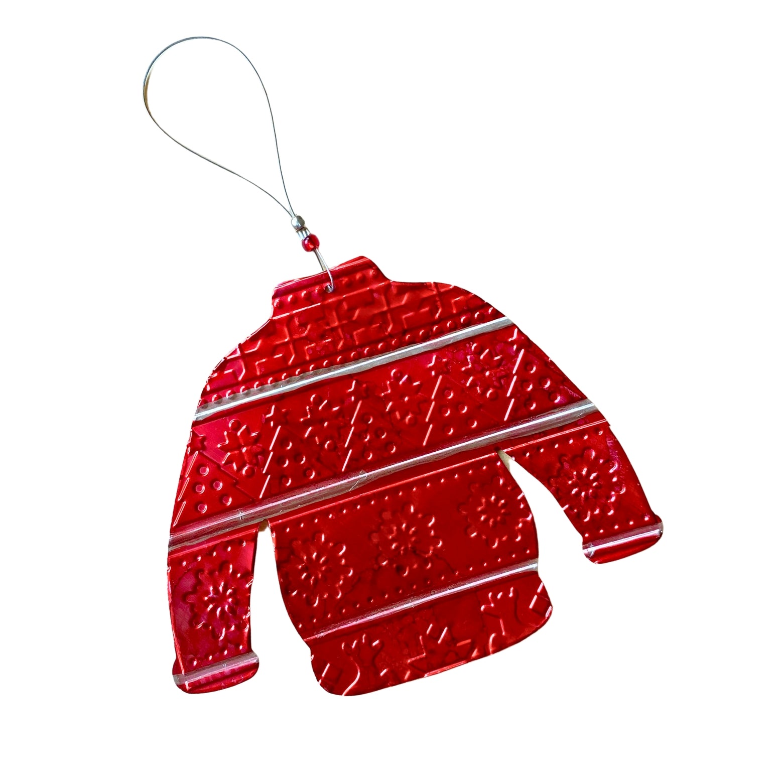 Add a touch of whimsy to your holiday decor with this Aluminum Can Ornament. One side is hand-painted by Seatree Studio, each one is unique with slight variations in color, while the other is unpainted to show it was made from recycled materials. Perfect for anyone looking for a sustainable and playful addition to their Christmas tree. (Bead colors and backing are random and will vary).