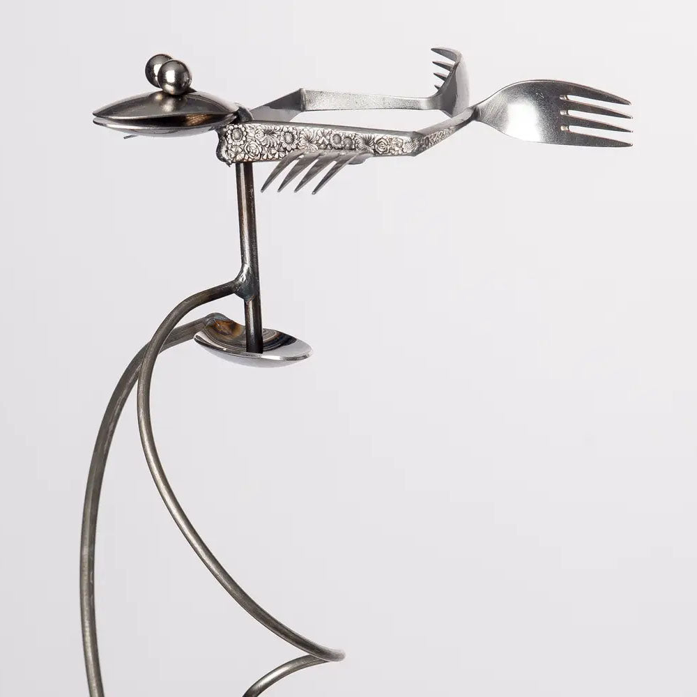 This off-kilter amphibian is handcrafted from stainless steel flatware—forks form its body and feet, while spoons shape its wide-eyed head. It balances playfully on a spiral arm, swaying in the breeze with the help of a lily pad counterweight.