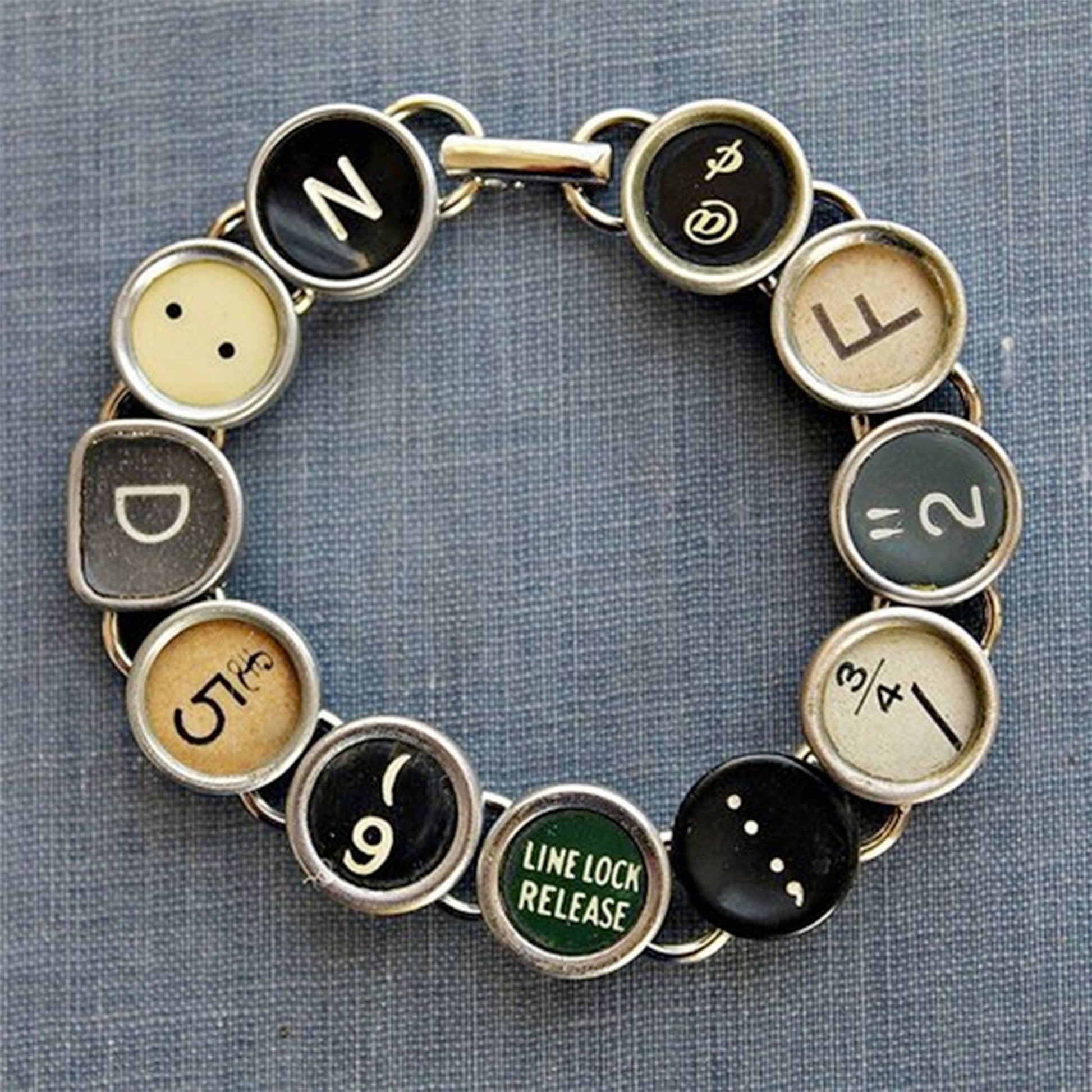 A perfect gift for the writer or antique collector in your life—or yourself—this is a bracelet made with 11 random typewriter keys with a fold-over clasp. Each bracelet measures between 7- and 7½-inches in length. If the person wearing your bracelet has particularly small or large wrists, please contact us so we can assist you.