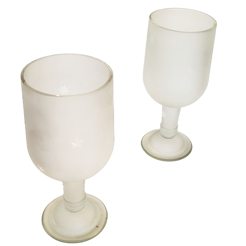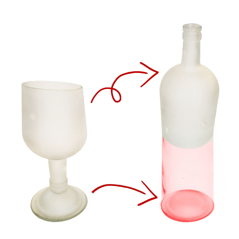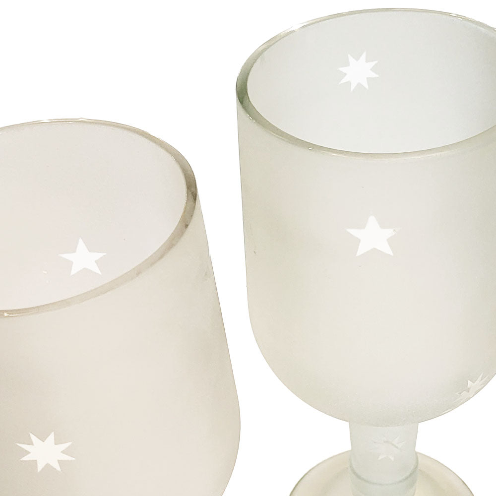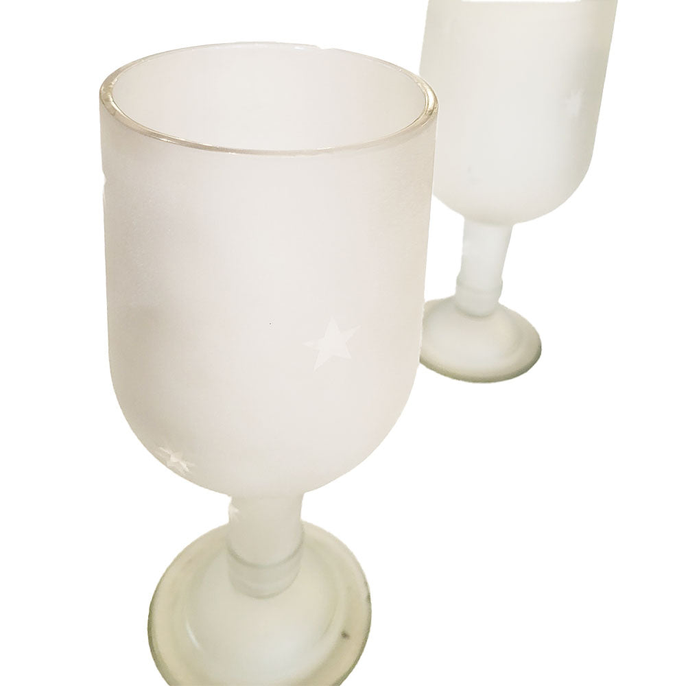 A toast to transformation: these goblets are made from repurposed clear glass bottles—possibly wine, possibly something a little more rebellious. The top of the bottle becomes the bowl and stem, while the bottom forms the glass’s base, flipping expectations in the most delightful way. Frosted all over and speckled with clear stars, they shimmer just enough to show off.